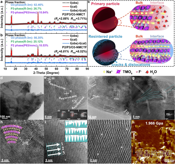 當(dāng)前,鈉離子電池因其高經(jīng)濟效益、豐富的資源以及較好的電化學(xué)性能而被廣泛關(guān)注,尤其在大規(guī)模能源存儲系統(tǒng)中具有巨大的潛力。然而,鈉離子電池的高能量密度和長循環(huán)壽命仍然是其應(yīng)用的關(guān)鍵挑戰(zhàn)。在高電壓下,層狀氧化物正極面臨晶格氧不可逆損失、電極與電解質(zhì)界面副反應(yīng)等問題。同時,由于鈉離子嵌入/脫出過程中的各向異性晶格膨脹和收縮會引起嚴(yán)重的體積變化,造成二次顆粒內(nèi)應(yīng)力積累。此外,取向各異的Na+通路及晶界不僅限制了Na+的擴散,也使顆粒內(nèi)Na+分布不均,產(chǎn)生內(nèi)應(yīng)力和局部晶格失配。隨著循環(huán)過程的進(jìn)行逐漸產(chǎn)生晶間裂紋和晶內(nèi)裂紋,加速電解液滲透和界面副反應(yīng),造成正極材料的失效。當(dāng)前鈉離子電池中主要通過元素?fù)诫s或表面包覆緩解體積變化和界面穩(wěn)定性問題,但這無法解決材料本身存在的問題。