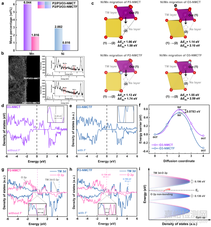 通過循環(huán)后電極的表征和DFT計算研究發(fā)現(xiàn),表面氟化有效抑制了過渡金屬遷移和溶解,減輕了材料表面副反應(yīng)。同時復(fù)合結(jié)構(gòu)中,氟離子通過強電負(fù)性錨定作用增強了表面P2結(jié)構(gòu)中晶格氧的穩(wěn)定性,縮小了帶隙,提升了電子導(dǎo)電性。對于內(nèi)部O3結(jié)構(gòu)而言,氟離子的滲入同樣優(yōu)化了材料內(nèi)部的電子導(dǎo)電性以及降低體相鈉離子的擴散能壘,提升了動力學(xué)性能。