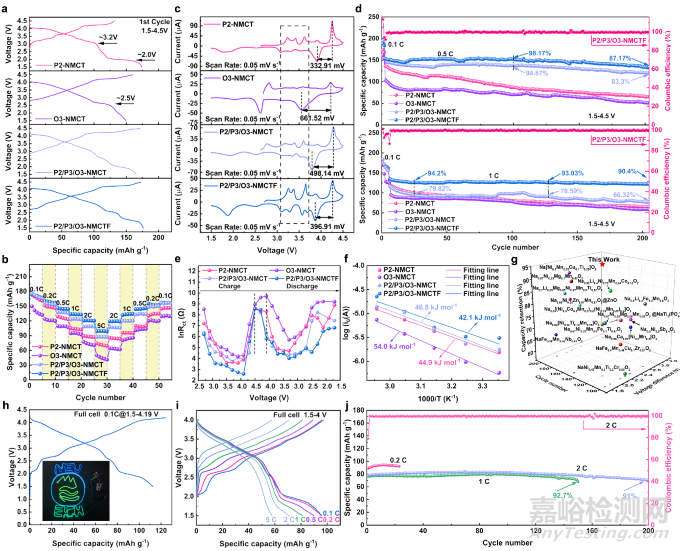 通過對O3型錳基正極采用淬火策略后,設(shè)計得到的P2/P3/O3-Na0.89Ni0.3Mn0.55Cu0.1Ti0.05O1.94F0.06在1.5-4.5V的寬電壓范圍內(nèi)表現(xiàn)出卓越的電化學(xué)性能,在 0.1 C(1 C = 150 mA g-1)條件下的可逆容量為187.6 mAh g-1。在0.5 C和1 C下循環(huán) 200 次后,可逆容量分別為 133.13 mAh g-1 和 121.89 mAh g-1,保持率分別為87.17%和90.4%。同時,在其與硬碳負(fù)極組裝而成的全電池中也表現(xiàn)出很好的穩(wěn)定性。這項工作為鈉離子電池高性能復(fù)合正極材料的開發(fā)和穩(wěn)定機制提供了新的途徑和見解。