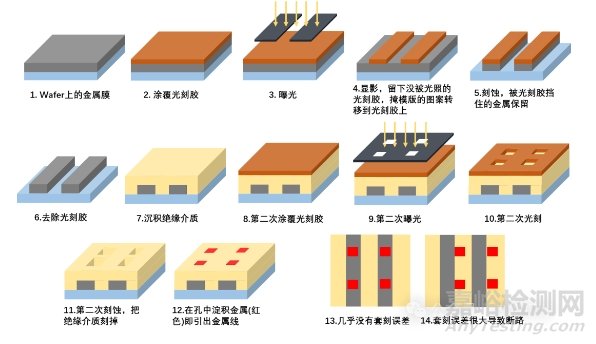 在芯片制造工藝中,圖案是先存在于掩模版(Mask,也叫光罩)之上,之后經(jīng)過曝光顯影轉(zhuǎn)移到光刻膠上,再經(jīng)過刻蝕等工藝轉(zhuǎn)移到wafer上,然后去掉光刻膠,圖案就存在于wafer上。例如,下圖是通過光刻以及刻蝕產(chǎn)生金屬連線的過程,