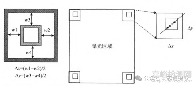 圖2 “box in box”型的套刻標(biāo)記,ΔX和ΔY就是在x和y方向上的套刻誤差,右圖是套刻標(biāo)記在shot中的位置
