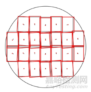 下圖就是所謂的inter-field套刻誤差, a圖是參考層的shot布局,黑點(diǎn)是shot的中心位置,曝光時(shí)wafer步進(jìn)移動(dòng),掩模版對(duì)準(zhǔn)到下一個(gè)shot上,然后進(jìn)行掃描曝光(shot會(huì)有重疊),直到整片wafer全部曝光完成;參考層中每個(gè)shot的中心位置點(diǎn)相連組成了一個(gè)網(wǎng)格(b圖中藍(lán)線)。