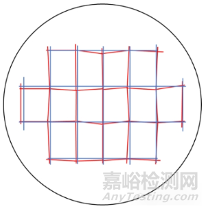 然后到了當(dāng)前層的曝光,最好的結(jié)果也就是套刻誤差為0應(yīng)該是與前一層的shot完全對(duì)準(zhǔn),但實(shí)際上會(huì)像下圖中一樣有偏差,a圖紅框代表當(dāng)前層的shot,與參考層的shot沒有完全對(duì)準(zhǔn)有所偏差。當(dāng)前層的shot中心(紅點(diǎn)兒)也構(gòu)成了一個(gè)網(wǎng)格,這個(gè)網(wǎng)格與參考層網(wǎng)格(藍(lán)線)之間的偏差就是inter-field套刻誤差。10個(gè)參數(shù)中的6個(gè)參數(shù)修正的就是整個(gè)網(wǎng)格。