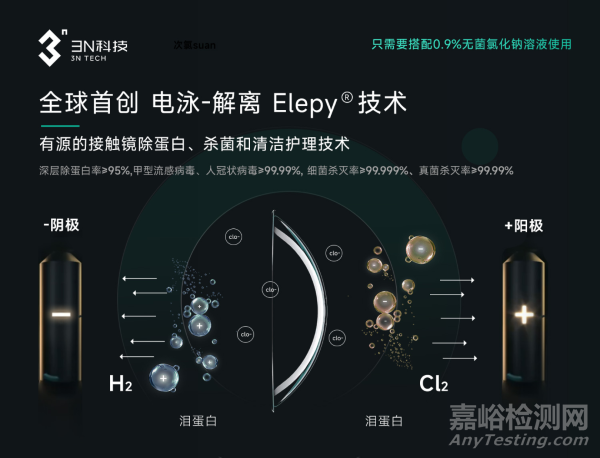 將鏡片放置于含0.9%無菌氯化鈉溶液的電泳解離倉內(nèi),通過儀器底座對倉內(nèi)電極施加直流電形成場強,利用蛋白質(zhì)帶電荷且可以在電場中移動的特性,使得鏡片材料間隙或表面的淚蛋白進行定向物理移動,是生物學(xué)中“蛋白電泳”的全新應(yīng)用;“電化學(xué)解離”則是通過電解0.9%無菌氯化鈉溶液,產(chǎn)生可以對鏡片附著的微生物進行高效消殺的含氯鹽溶液。