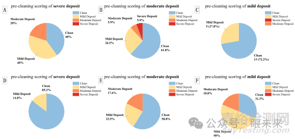 實驗組和對照組在清洗前、清洗后鏡片樣本和試鏡殘留溶液中檢測到的微生物陽性率分別為 4/76 vs 1/74 (P = 0.37)、1/76 vs 0/74 (P = 1.00)和 0/76 vs 8/74 (P = 0.006)。去除蛋白質(zhì)后,實驗組鏡片被評為 "清潔 "或 "輕度沉淀 "的比例(96.4%,79/82)明顯高于對照組(85.7%,66/77),差異顯著(P < 0.05)。