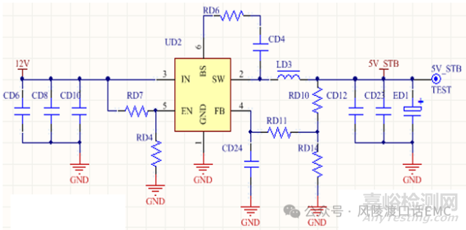 靜電放電過程中使用示波器測量12V轉(zhuǎn)5V DC-DC輸出端5V電壓,發(fā)現(xiàn)出現(xiàn)瞬間電壓跌落到2.96V,反復(fù)測量多次確認(rèn)DC-DC輸出端確實出現(xiàn)電壓跌落現(xiàn)象,12V轉(zhuǎn)5V DC-DC電路如下圖所示: