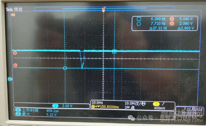 為確認(rèn)是否因5V DC-DC輸出電壓跌落引起系統(tǒng)自動待機問題,將DC-DC電源斷開使用穩(wěn)壓源提供系統(tǒng)5V供電,靜電放電系統(tǒng)自動待機現(xiàn)象消失,確認(rèn)是DC-DC輸出端電壓跌落引起后端系統(tǒng)工作狀態(tài)異常,DC-DC輸出電壓在靜電放電過程中測量波形如下圖所示: