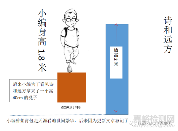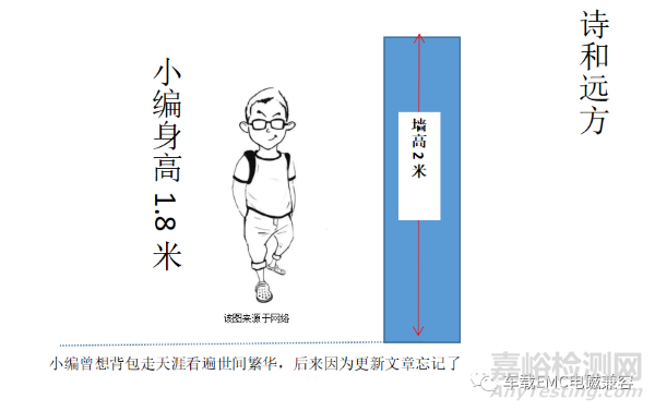 假設(shè)“詩和遠(yuǎn)方”在2米的墻外,此時(shí)小編身高只有1.8米這個(gè)時(shí)候小編是不是看不到外面的“詩和遠(yuǎn)方”。就好比前面提到的“當(dāng)EUT的測(cè)試數(shù)據(jù)比底噪低時(shí),測(cè)試數(shù)據(jù)會(huì)被底噪淹沒、這種情況下我們是無法掃描到樣機(jī)的實(shí)際信號(hào)。