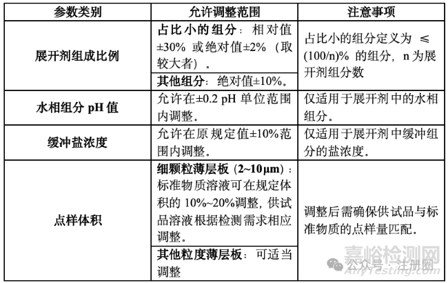 相比2020版藥典,2025藥典新增加了薄層色譜條件(參數(shù))允許調(diào)整的內(nèi)容,詳見下表: