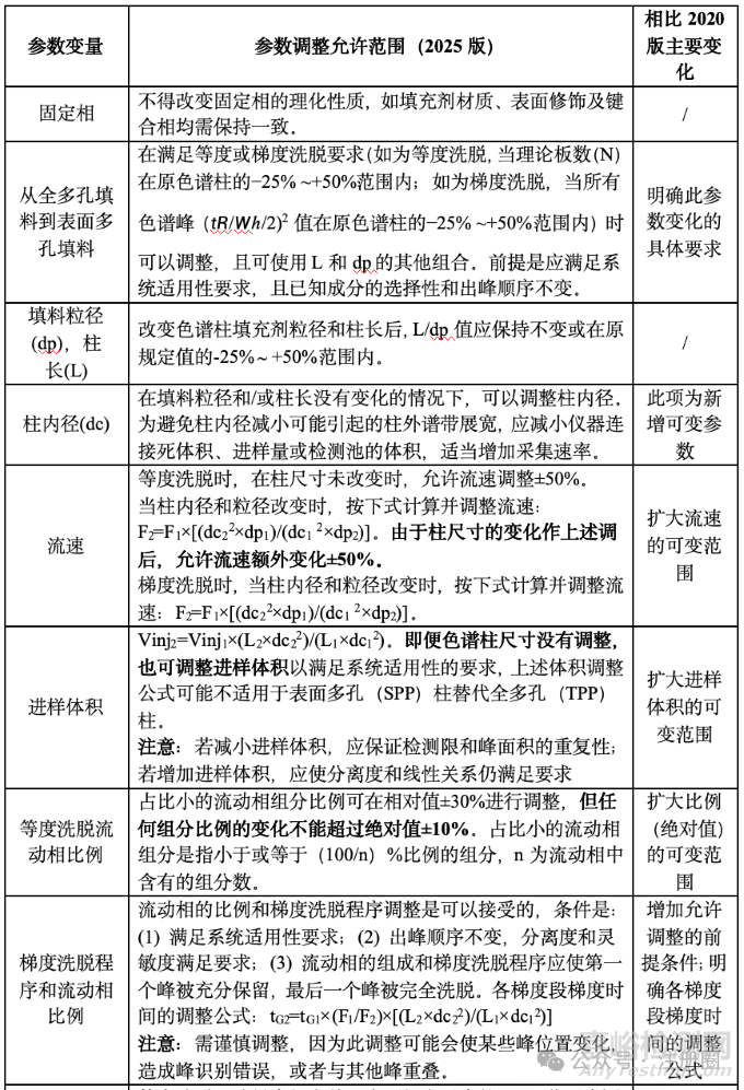相比2020版藥典,2025版藥典明確了色譜參數(shù)允許調(diào)整的前提條件,部分參數(shù)可調(diào)整范圍擴(kuò)大,詳見下表: