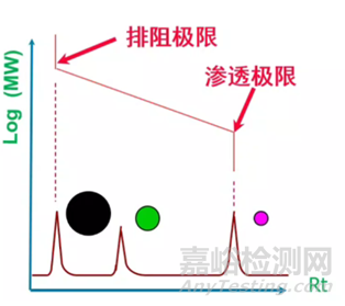 GPC是根據(jù)聚合物溶劑化后的大小在色譜柱上進(jìn)行排阻的,如果聚合物溶劑化后的體積過大,就無法進(jìn)行色譜柱的凝膠孔隙中進(jìn)行排阻。如果溶劑化的聚合物大小剛剛能進(jìn)入凝膠孔隙,此時對應(yīng)的聚合物的分子量大小被稱為排阻限(排阻極限)。如果聚合物的體積很小,剛剛能從色譜柱的凝膠孔隙中穿透出來,此時對應(yīng)的聚合物的分子量大小被稱為滲透限(滲透極限)。2個限值表明了色譜柱可分析的分子量的范圍。