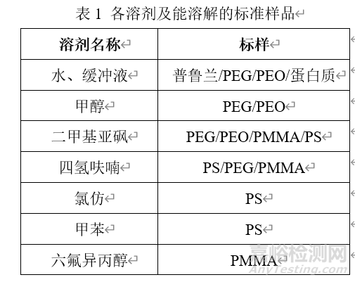 具體的各種溶劑和其對應(yīng)溶解的標(biāo)準(zhǔn)品如下表所示