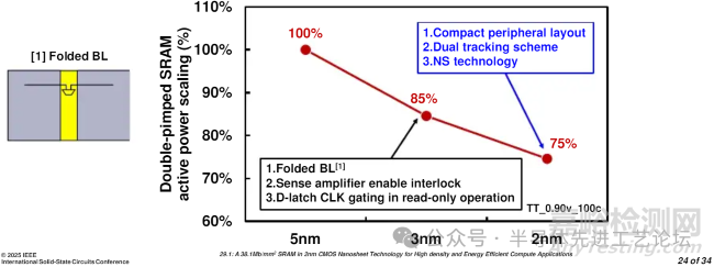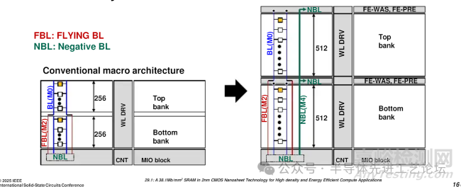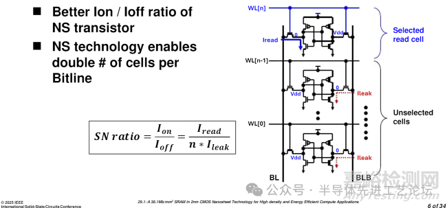 臺積電在2025年ISSCC SRAM專題會議中詳述其2nm(N2)節(jié)點的SRAM微縮路線。SRAM微縮在3nm節(jié)點停滯之后,于2nm節(jié)點實現(xiàn)部分重啟。臺積電基于2nm的SRAM宏單元采用0.021μm²存儲單元,陣列規(guī)模為4096×145(總?cè)萘?80Kb)。相較前代節(jié)點,存儲密度提升10%,達到38.1Mb/mm²。為實現(xiàn)這一目標,臺積電通過最大化存儲單元陣列規(guī)模并最小化外圍電路:2nm納米片晶體管技術(shù)改善了存儲單元的開關電流比,使得單條位線(BL)可負載的單元數(shù)量翻倍。相較于FinFET技術(shù)最大256單元/BL的限制,2nm技術(shù)允許其擴展至512單元/BL。此外,采用飛行位線(FBL)架構(gòu)進一步提升了陣列效率。這本質(zhì)上是利用納米片晶體管(NSH)較FinFET更優(yōu)的Ion/Ioff特性,重構(gòu)外圍電路設計。