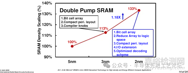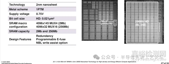 成功在2nm納米片(Nanosheet)工藝上驗證全功能高密度(HD)SRAM,實現(xiàn)38.1Mb/mm²存儲密度。