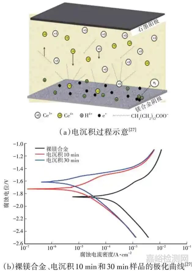 電化學沉積是指以鎂合金作為陰極,惰性金屬作為陽極,浸入電解液中,電解液中的離子在外電場作用下遷移的過程,并在電極上發(fā)生氧化還原反應(yīng)從而在鎂合金表面沉積形成電鍍層。同時,結(jié)合低表面能物質(zhì)修飾后獲得超疏水表面。