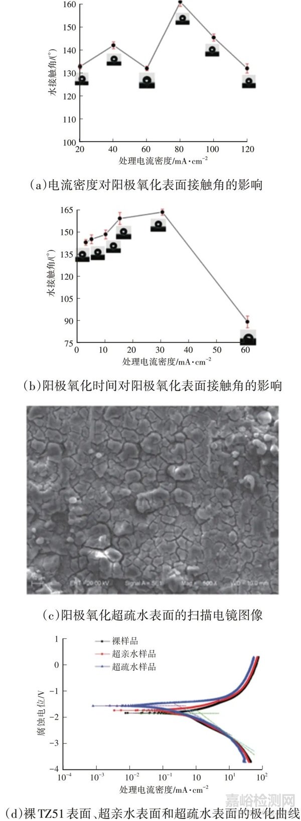 微弧氧化法又稱微等離子體氧化,依靠電弧發(fā)射引起的瞬時高溫、高壓在合金表面形成金屬氧化膜,然后再通過低表面能物質(zhì)修飾或結(jié)合其他技術(shù)獲得超疏水表面。