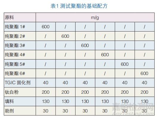 中密度纖維板不同于此前粉末噴涂較多的金屬基材,是一種木質(zhì)纖維復(fù)合材料,其主要成分是細木纖維和合成脂肪胺膠粘劑,板材在高溫下容易受損,因此噴涂于中密度纖維板上的粉末需要在(130-150)℃之間完成固化,我們選擇了6種支持低溫固化的聚酯按照表1的基礎(chǔ)配方對比了純聚酯1#到純聚酯6#制備的粉末涂料及其性能,結(jié)果如表2所示。