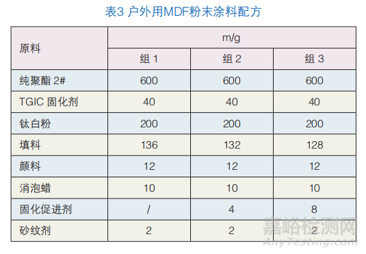 在體系中添加促進劑能夠有效的降低涂膜固化反應(yīng)的溫度,但具體添加量還需要通過具體的測試確定,基于表2篩選出的純聚酯2# ,延申三組配方探究促進劑添加量對于戶外用MDF粉末性能的影響。