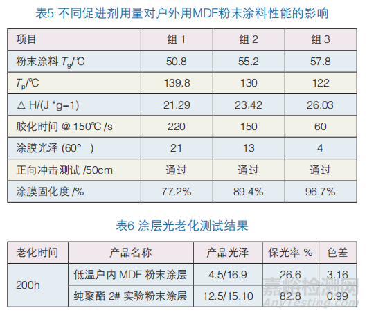 測試結(jié)果表明,當前實驗研發(fā)的戶外用MDF粉末涂料對于板材具有一定的防護性能,在原有戶內(nèi)產(chǎn)品的基礎(chǔ)上,豐富了耐人工氣候老化的性能,滿足實驗預(yù)期的結(jié)果,由于粉末噴涂后的中密度纖維板的耐候性能與板材前處理、噴涂工藝、固化程度以及具體使用環(huán)境等因素相關(guān),距離粉末噴涂中纖板廣泛應(yīng)用于商業(yè)市場還有待推進。