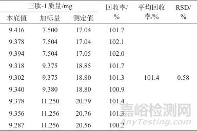 取約12 mg樣品,精密稱定,置于100 mL 容量瓶中,平行稱取9份,加入不同質(zhì)量的三肽-1,進行高、中、低3個水平的加標回收試驗。按1.3方法制備加標樣品溶液,在1.2儀器工作條件下測定,計算回收率和測定結(jié)果的相對標準偏差,結(jié)果見表1。由表1可知,三肽-1的加標平均回收率為101.4%,測定結(jié)果的相對標準偏差為0.58%。表明該方法準確性和精密度良好。
