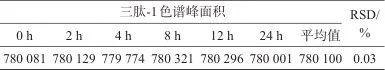 按1.3方法制備樣品溶液,分別在第0、2、4、8、12、24h進樣測定,結(jié)果見表2。由表2可知,三肽-1色譜峰面積測定結(jié)果的相對標準偏差為0.03%,表明樣品溶液在24 h內(nèi)穩(wěn)定性良好。