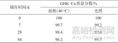 取某廠家提供的藍色晶體原料,置于40 ℃烘箱中保存,分別在第7、28、84 d測定GHK-Cu的含量并與初始含量比較,考察其熱穩(wěn)定性;將原料置于照度為4 500 lx的光照箱內(nèi),分別于第7、28、84 d測定GHK-Cu的含量并與初始含量比較,考察其光照穩(wěn)定性,結(jié)果見表3。由表3可知,經(jīng)84 d的熱穩(wěn)定性和光照穩(wěn)定性試驗,樣品中GHK-Cu的質(zhì)量分數(shù)分別為初始值的96.2%、95.7%,表明在84 d內(nèi)該藍色晶體原料穩(wěn)定性良好,能夠滿足后續(xù)化妝品制劑調(diào)配的要求。