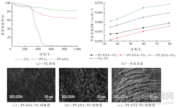 從圖2(a)可知,PVA和PVA/SA在350~500 ℃間出現(xiàn)較大質(zhì)量損失,這主要是PVA分子鏈斷裂,聚合物揮發(fā)導(dǎo)致的失質(zhì)量,由此計(jì)算出PVA/SA中PVA含量約為18%。由圖2(b)可知,PVA/SA 摻量由1% 增大到5%時,保溫隔熱涂料導(dǎo)熱系數(shù)先降低后增大,且PVA/SA 摻量為3% 時導(dǎo)熱系數(shù)最低。此外以Acronal 7026G 乳液、21%HGM 和3%SA 制備保溫涂料,結(jié)果表明其導(dǎo)熱系數(shù)遠(yuǎn)大于PVA/SA保溫涂料,因此PVA/SA相較于SA在保溫涂料應(yīng)用中有一定優(yōu)勢。由圖2(c)~(e)可以明顯看出,PVA/SA摻量為1%和3% 時,保溫涂層中復(fù)合氣凝膠多孔網(wǎng)絡(luò)結(jié)構(gòu)正常,孔隙率豐富,這是由于PVA/SA兼具疏水性和柔韌性,且其三維多孔網(wǎng)絡(luò)為納米級孔結(jié)構(gòu),因此在制備保溫隔熱涂料過程中復(fù)合氣凝膠很大程度地保留了其原始的微觀形貌和孔結(jié)構(gòu),這也是涂層表現(xiàn)出優(yōu)異隔熱性能的重要原因之一。而當(dāng)PVA/SA摻量增加至5%時,明顯觀察到復(fù)合氣凝膠被壓縮堆積在一起,孔隙率大幅度減小,因此涂層導(dǎo)熱系數(shù)也隨之增大。研究結(jié)果表明,PVA/SA摻量為3%時,保溫隔熱涂料導(dǎo)熱系數(shù)最低。