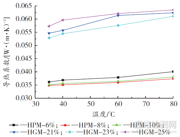 由圖3可知,不同測試溫度下HPM 保溫隔熱涂料的導(dǎo)熱系數(shù)均遠(yuǎn)小于HGM的,且HGM和HPM的最佳摻量分別為23%和8%,35 ℃時最低導(dǎo)熱系數(shù)分別為0.052 9 W/( m·K)和0.034 9 W/(m·K)。結(jié)合表1 分析,HPM 的密度和導(dǎo)熱系數(shù)均遠(yuǎn)小于HGM 的,HPM更小的粒徑和更低的密度表明其具備更大的內(nèi)部空腔,這與它制備的涂層具有更低的導(dǎo)熱系數(shù)密切相關(guān)。