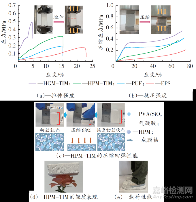 由圖4(a)可知,HGM-TIM和HPM-TIM的拉伸強(qiáng)度優(yōu)于PUF和EPS,但HGM-TIM的拉伸形變率較低,而HPM-TIM表現(xiàn)出與PUF相當(dāng)?shù)睦煨巫兟省S蓤D4(b)可知,4種保溫材料都具有較大的壓縮形變能力,其壓縮形變率大于60%。由圖4(c)可知,將高度為22 mm的HPM-TIM施加外力使高度降低至7 mm,撤去外力后發(fā)現(xiàn)高度依然可恢復(fù)至22 mm,此過程中HPM-TIM的壓縮形變率達(dá)到68%,該過程更直觀地展現(xiàn)了HPMTIM優(yōu)異的壓縮形變恢復(fù)能力,這主要取決于HPM優(yōu)異的壓縮回彈性和PVA/SA良好的柔韌性。通過計(jì)算得到HGM-TIM 和HPM-TIM 的密度分別為0.141 4 g/cm3和0.056 8 g/cm3,HPM-TIM可輕松放置在盛開的花瓣上,且花瓣不會被壓彎[圖4(d)]。尺寸為300 mm×300 mm×15 mm的HPM保溫隔熱板可以完全承載一位成年人的質(zhì)量而不發(fā)生任何變形[圖4(e)],表明HPM-TIM具有優(yōu)異的載荷能力。綜上所述,HGMTIM和HPM-TIM表現(xiàn)出輕質(zhì)、良好的力學(xué)性能和優(yōu)異的載荷能力,具備在保溫隔熱領(lǐng)域規(guī)?;瘧?yīng)用的潛力。