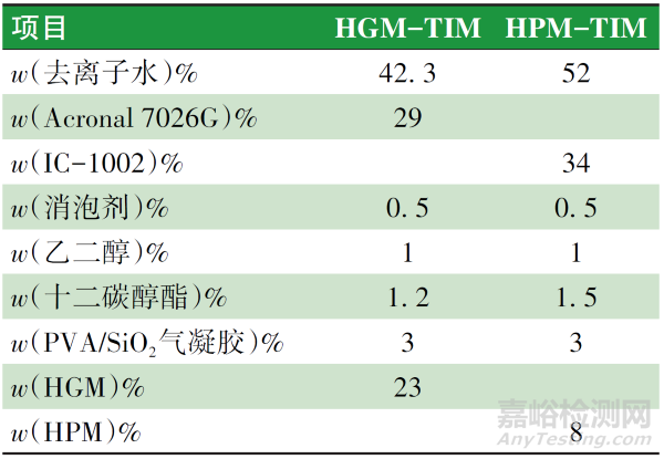 在常溫常壓下,膏狀保溫隔熱涂料的制備過程如下:參考表2配方,將Acronal 7026G或IC-1002添加到去離子水中并充分?jǐn)嚢?0 min。依次將消泡劑、乙二醇和十二碳醇酯添加到上述分散液中攪拌10 min。然后加入PVA/SA 連續(xù)攪拌30 min,獲得黏稠狀預(yù)分散體。最后,將預(yù)分散體轉(zhuǎn)移到行星攪拌器中,分別加入空心玻璃微球(HGM)或中空聚合物微球(HPM),連續(xù)攪拌1 h,得到均勻分散的保溫隔熱涂料(TIM),分別命名為HGM-TIM和HPM-TIM。
