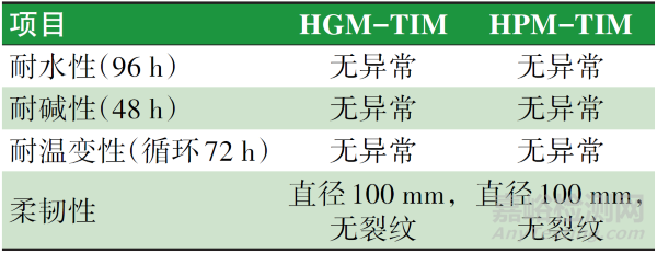 表3 為HGM-TIM 和HPM-TIM 的耐水性、耐堿性、耐溫變性和柔韌性測試結(jié)果。