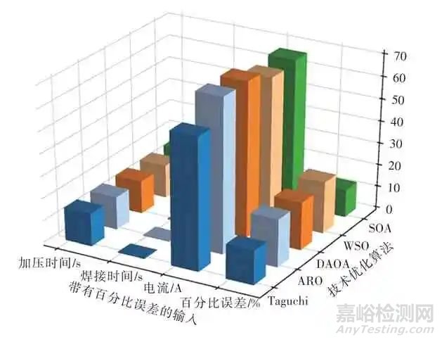 Bhuyan[12]采用田口正交陣算法(Taguchi’s Orthogonal Array Method)對(duì)AISI 4041不銹鋼與AISI 304L不銹鋼的電阻點(diǎn)焊過(guò)程進(jìn)行研究,優(yōu)化了焊接電流、焊接時(shí)間以及加壓時(shí)間等。如圖1所示,該研究還將此優(yōu)化結(jié)果與人工兔優(yōu)化(Artificial Rabbits Optimization,ARO)算法、動(dòng)態(tài)算術(shù)優(yōu)化算法(Dynamic Arithmetic Optimization Algorithm,DAOA)、鯨鯊優(yōu)化(Whale Shark Optimization,WSO)算法以及技能優(yōu)化算法(Skill Optimization Algorithm,SOA)進(jìn)行了對(duì)比。研究結(jié)果顯示,相較于ARO、WSO和SOA算法,DAOA算法在錯(cuò)誤率方面表現(xiàn)出色,僅為0.62%,且其最優(yōu)適應(yīng)度與試驗(yàn)所得的最高拉伸剪切應(yīng)力高度吻合,驗(yàn)證了DAOA算法在電阻點(diǎn)焊參數(shù)優(yōu)化中的有效性和優(yōu)越性。