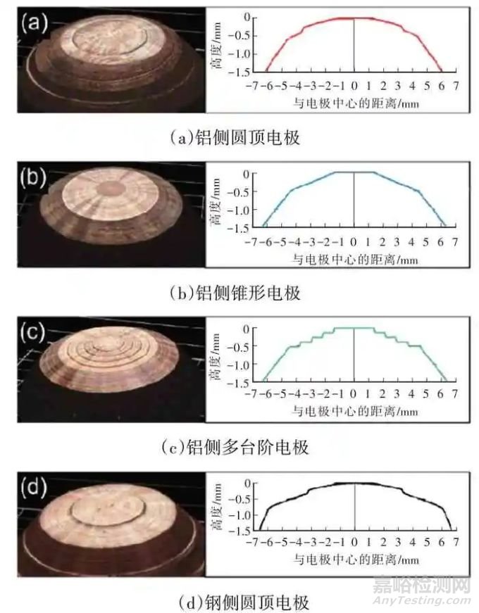 膠接點(diǎn)焊巧妙地將電阻點(diǎn)焊的穩(wěn)固連接特性與膠接的強(qiáng)韌結(jié)合優(yōu)勢(shì)相融合,形成了一種獨(dú)特的復(fù)合連接工藝。相較于傳統(tǒng)的電阻點(diǎn)焊,膠接點(diǎn)焊通過(guò)引入膠接層,顯著增強(qiáng)了接頭的拉剪強(qiáng)度和疲勞耐久性[42],在同種金屬材料的連接領(lǐng)域已展現(xiàn)出應(yīng)用價(jià)值,然而,在異種金屬,尤其是鋁/鋼等組合的連接上,其應(yīng)用探索尚顯不足。因此,探討膠接點(diǎn)焊在鋁/鋼異種焊接中的應(yīng)用潛力,對(duì)于拓寬該技術(shù)的適用范圍、提升異種金屬連接性能具有重要意義。Chen等[43]在鋁/鋼膠接點(diǎn)焊的研究中遇到了直接焊接方式下鋁/鋼界面殘余膠過(guò)量的問(wèn)題,該問(wèn)題導(dǎo)致熔核中夾雜物增多以及IMC層異常增厚,進(jìn)而對(duì)接頭的整體性能產(chǎn)生了不利影響。為此,Chen等結(jié)合預(yù)清潔電流脈沖技術(shù)設(shè)計(jì)了一種多臺(tái)階形貌的電極(見(jiàn)圖9),不僅有效清除了接頭中的夾雜物,還成功抑制了IMC層的過(guò)度增長(zhǎng)。試驗(yàn)結(jié)果顯示,改進(jìn)后,固化完成的膠接點(diǎn)焊接頭性能得到顯著提升,達(dá)到了約20%的增強(qiáng)效果。