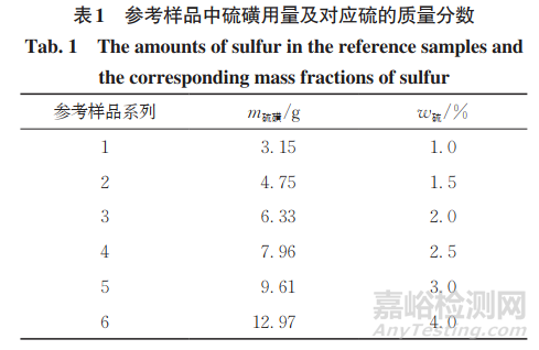 考慮硫磺用量時,硫含量應(yīng)覆蓋一定的范圍以滿足測定需求,結(jié)合批量檢測實際樣品中常見硫含量情況,選擇制備6個濃度水平的參考樣品,人工配制參考樣品中硫磺用量及對應(yīng)的硫的質(zhì)量分?jǐn)?shù)如表1所示。