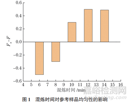 由圖1可知:當(dāng)混煉時間不大于 8min時,F(xiàn)α−F為負(fù)值,說明此時參考樣品的均勻性較差,無法滿足要求;隨著混煉時間的延長,硫磺分散均勻度逐漸提高,當(dāng)混煉時間為10min時,F(xiàn)α−F轉(zhuǎn)為正值,說明此時參考樣品的均勻性較好,可以滿足要求;當(dāng)混煉時間不小于12min時,參考樣品的Fα−F 趨于穩(wěn)定,說明此時參考樣品內(nèi)部的硫磺已得到了充分的分散。因此,試驗選擇的混煉時間為12min。