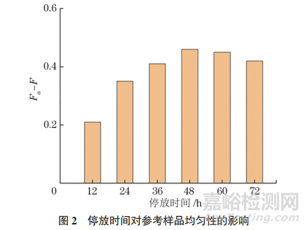 經(jīng)過開煉機(jī)出片后,混煉膠在硫化前需要經(jīng)過一段時間的停放,這個過程并非是靜態(tài)的,而是硫磺等組分進(jìn)一步均勻分散的過程,該過程對于確保參考樣品的均勻性和一致性起到了不可或缺的作用。圖 2 給出了在不同停放時間下,參考樣品均勻性的變化趨勢。