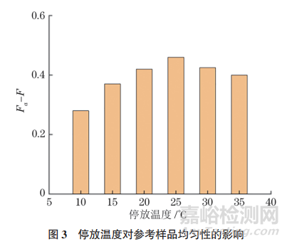 根據(jù)聚合物的時溫等效性原理,停放溫度與停放時間對參考樣品的均勻性起著同等重要的作用。適當(dāng)提高混煉膠的停放溫度可以促進(jìn)膠料內(nèi)部大分子和硫化體系的熱運(yùn)動,從而使硫磺等組分能夠更均勻地分散在膠料中。圖 3 給出了在不同停放溫度下,參考樣品均勻性的變化趨勢。