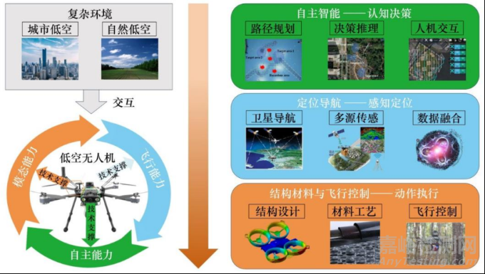 低空無人機通常指在1000 m(含)以下低空和超低空空域中飛行的無人機,在低空環(huán)境中易受到惡劣天氣、障礙物遮擋、信號干擾等因素的影響,因此對無人機的抗干擾能力和操控性能提出了較高的需求。結(jié)構(gòu)材料與飛行控制、定位導航、自主智能分別是低空無人機提升模態(tài)、飛行、自主能力的核心技術(shù)。結(jié)構(gòu)材料技術(shù)通過輕量化、高強度設(shè)計和先進復合材料的應(yīng)用,優(yōu)化機體性能,提升飛行效率、耐久性和環(huán)境適應(yīng)性,是無人機自身能力的重要基礎(chǔ)。通過結(jié)構(gòu)與材料設(shè)計并結(jié)合無人機飛行控制算法,無人機能夠初步實現(xiàn)遙控飛行。若要進一步完成復雜任務(wù),則需要無人機具備精確的定位導航技術(shù),以在復雜干擾環(huán)境中依靠定位技術(shù)獲取其在空間和時間中的位置,順利到達指定航跡點。隨著人工智能技術(shù)的快速發(fā)展,無人機逐漸朝著智能化的方向邁進。無人機自主智能技術(shù)指面向高動態(tài)、強實時、不透明的任務(wù)環(huán)境,無人機能夠按照任務(wù)要求自主規(guī)劃飛行路徑、自主識別目標以進行信息推理、并用自然語言與人交互等。加強低空無人機關(guān)鍵技術(shù)體系研究,完成從遙控飛行向復雜環(huán)境中自主飛行轉(zhuǎn)型,對低空無人機創(chuàng)新應(yīng)用和低空經(jīng)濟高質(zhì)量發(fā)展具有重要戰(zhàn)略意義。