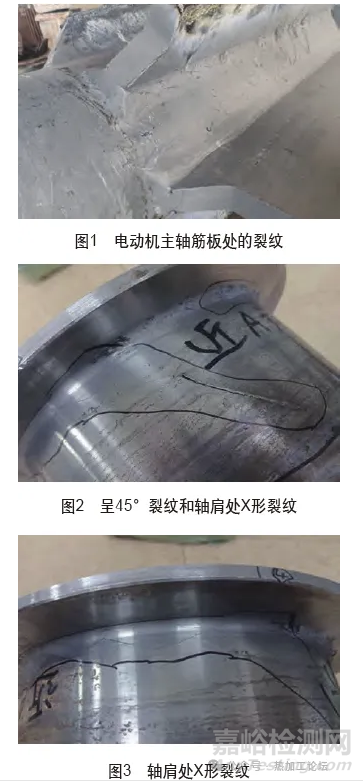 某除塵用增壓鼓風(fēng)機(jī)的電動機(jī)在運行僅2.5個月時,監(jiān)控人員發(fā)現(xiàn)電動機(jī)主軸軸瓦溫度突然升高,停機(jī)檢查后發(fā)現(xiàn)電動機(jī)主軸有X形裂紋,用PDXUC-320C型超聲探傷儀對其進(jìn)行檢測,發(fā)現(xiàn)裂紋最深約53mm,上下軸瓦均有損傷,將電動機(jī)主軸拆下后,發(fā)現(xiàn)電動機(jī)主軸和筋板上均出現(xiàn)裂紋(見圖1),其中電動機(jī)主軸的軸承支撐處產(chǎn)生與軸向呈45°裂紋(見圖2),軸肩處產(chǎn)生X形交叉裂紋(見圖3)。