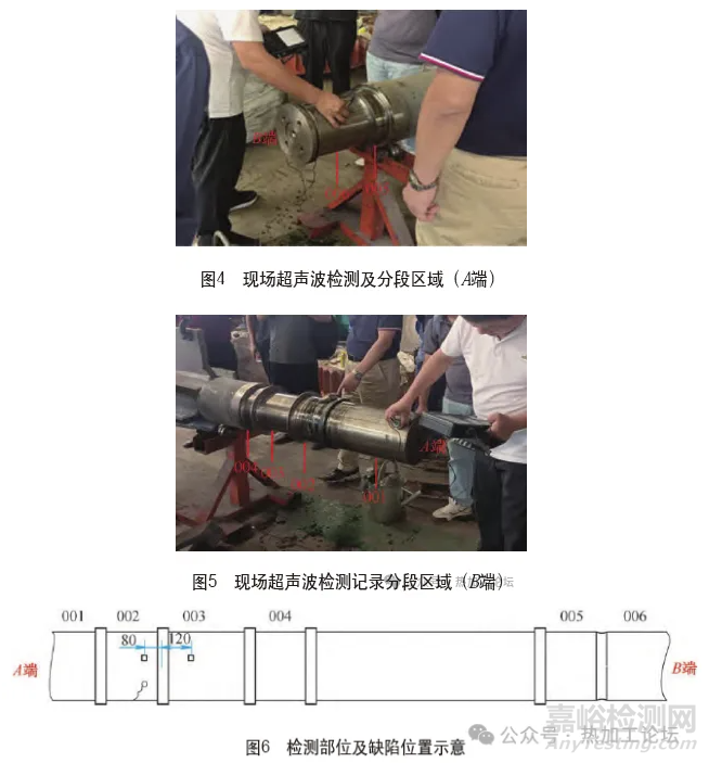 (2)電動機(jī)主軸的超聲波檢測結(jié)果001段未檢測出缺陷;002段存在連續(xù)性超標(biāo)缺陷,缺陷位置為002段與003段交界臺階左側(cè)80mm處3~8點方向,深度為43~48mm;003段存在連續(xù)性超標(biāo)缺陷,缺陷位置為002段與003段交界臺階右120mm處整個圓周,深度為45~53mm;004段、005段、006段均未檢測出缺陷。