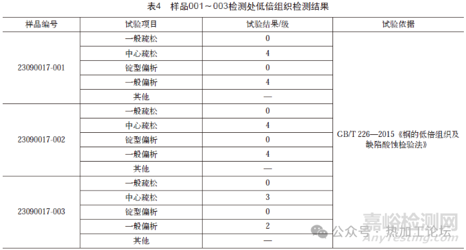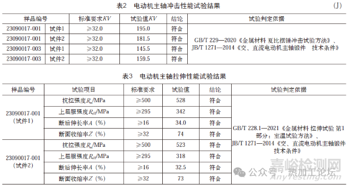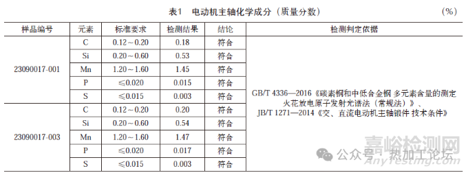 2)樣品23090017-001、23090017-003的化學(xué)成分和力學(xué)性能檢測結(jié)果符合JB/T1271—2014《交、直流電動機(jī)主軸鍛件技術(shù)條件》的規(guī)定。