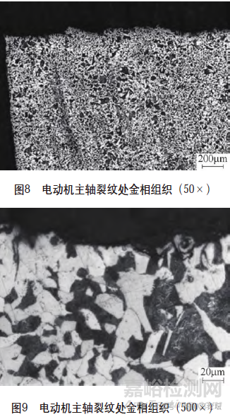(3)微觀組織檢測樣品001~003段低倍組織檢測結(jié)果見表4;電動機(jī)主軸非金屬夾雜物微觀形貌如圖7所示,其檢測結(jié)果見表5。電動機(jī)主軸裂紋處金相組織如圖8、圖9所示;電動機(jī)主軸心部A、B端金相組織分別如圖10、圖11所示。