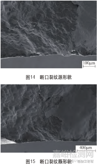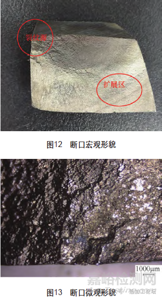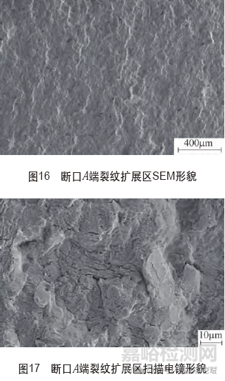 (1)斷口低倍形貌通過斷口宏觀觀察及金相顯微鏡檢測,斷口有明顯的裂紋源、裂紋擴(kuò)展區(qū),裂紋擴(kuò)展區(qū)有疲勞輝紋,如圖12、圖13所示。