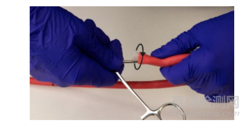 完全打開(kāi)5英寸直型平滑鉗口止血鉗,將鉗口插入塑料塞與橡膠管腔之間;