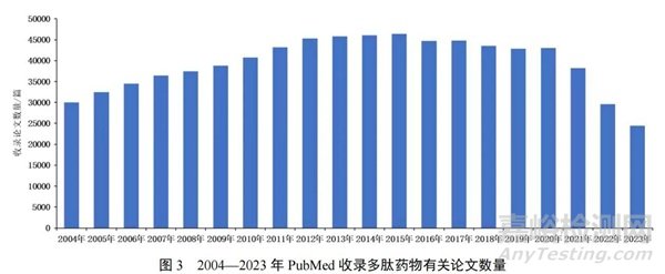 從學(xué)術(shù)研究看,總體上多肽藥物研究呈現(xiàn)持續(xù)性強(qiáng)、熱度居高不下的總體態(tài)勢(shì)(如圖3所示)。