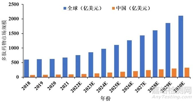 圖1 2018—2030年全球多肽藥物市場(chǎng)規(guī)模及預(yù)測(cè)