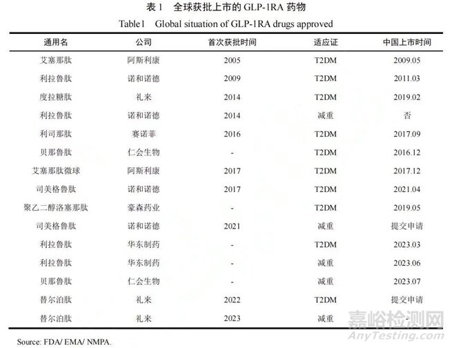 截至2023年底,全球已有10款GLP-1RA藥物獲批上市(表1),主要用于2型糖尿病(Type 2 diabetes,T2DM)的治療,其中利拉魯肽(Liraglutide)、司美格魯肽、貝那魯肽(Benaglutide)及替爾泊肽(Tirzepatide)獲批減重適應(yīng)癥。