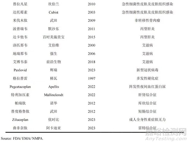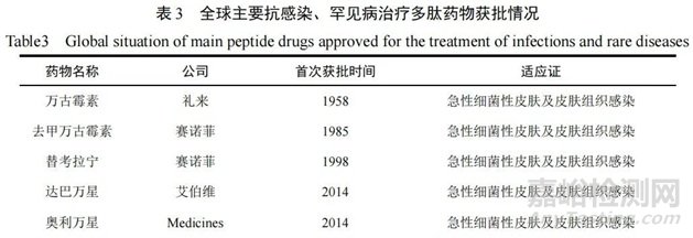 罕見病指發(fā)病率非常低的疾病,又被稱為“孤兒病”,世界衛(wèi)生組織將其定義為患病人數(shù)占總?cè)丝?.65‰~1‰的疾病。罕見病發(fā)病率低但種類多,致殘率高且可治性低,是危害人類健康特別是兒童健康的重大疾病。多個(gè)國(guó)家鼓勵(lì)罕見病治療藥品研發(fā),其中由梯瓦制藥研發(fā)并于1997年上市的格拉替雷曾是多肽藥物中最大的品種,用于治療多發(fā)性硬化癥,2016年全球銷售額高達(dá)42.23億美元。臨床試驗(yàn)證實(shí),醋酸格拉替雷可以降低復(fù)發(fā)性多發(fā)性硬化癥患者的復(fù)發(fā)頻率,適用于治療復(fù)發(fā)型多發(fā)性硬化成人患者,包括臨床孤立綜合征、復(fù)發(fā)緩解型多發(fā)性硬化和活動(dòng)性繼發(fā)進(jìn)展型多發(fā)性硬化。近年來,由于各種多發(fā)性硬化癥新藥和仿制藥沖擊,格拉替雷市場(chǎng)受到擠壓,2022年銷售額降至6.91億美元。同年,阿卡迪亞開發(fā)的曲非奈肽(Trofinetide)獲得美國(guó)批準(zhǔn),主要通過減少神經(jīng)炎癥和支持突觸功能,達(dá)到治療雷特綜合征核心癥狀的目的,是全球首個(gè)被批準(zhǔn)用于治療該病的藥物,具有里程碑意義,在歐洲被授予孤兒藥資格認(rèn)定。全球部分抗感染、罕見病治療多肽藥物獲批情況如表3所列。