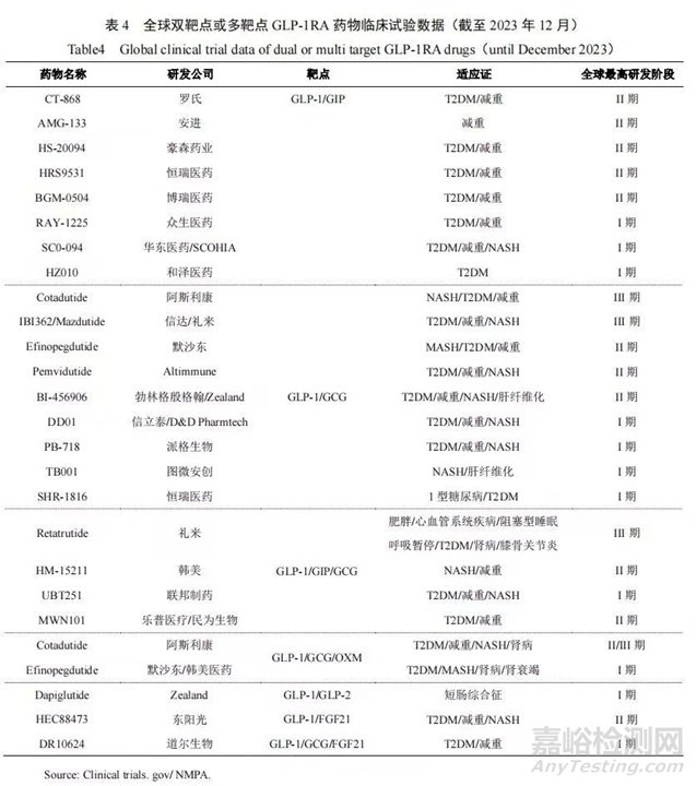 雙靶點(diǎn)或多靶點(diǎn)的GLP-1RA藥物在療效上表現(xiàn)出獨(dú)特優(yōu)勢(shì),成為行業(yè)競(jìng)相角逐的熱門領(lǐng)域。當(dāng)前,全球有超30家企業(yè)密集進(jìn)軍多靶點(diǎn)藥物研發(fā)(臨床試驗(yàn)),大部分集中在GLP-1/GIP(Glucose-dependent insulinotropic polypeptide,葡萄糖依賴性促胰島素)、GLP-1/GCG(Preproglucagon,前胰高糖素原)、GLP-1/GIP/GCG、GLP-1/GCG/OXM(Oxyntomodulin,胃泌酸調(diào)節(jié)素)等,具體如表4所示。