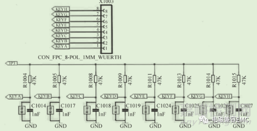 除此之外,可以直接選用一些典型的抗靜電干擾元器件,對電路進行防護。對于直接傳導的靜電放電干擾,可以嘗試在 I/O 接口處串聯電阻或并聯二極管至正負電源端。另外,在 I/O 信號線進入設備外殼處安裝一個對地的電容,能夠將接口電纜上感應的靜電放電電流分流到機箱上,避免流入電路,造成干擾。后文整改實例中采用的就是這種方式。